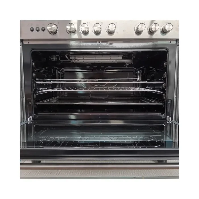 | COCINA DE 5 HORNALLAS ACERO INOXIDABLE DE ALTA RESISTENCIA -Tamaño 90x58x77 cm / 115 L -Puerta del horno plano de vidrio -Rejilla reforzada -Cubierta superior de vidrio -Encendido electrico -Doble entrada de GAS Izquierda/Derecha -Luz en el horno -Temporizador - Grill superior -Asador/ Rostizador giratorio -Tipo de gas - GLP/GNV -Voltaje 220-240V- 50Hz-60Hz -Potencia 29W -Categoria I3 B P -Presion de Gas 28-30 mbar -Potencia entrada de gas 15.okW Accesorios en el horno -2 rejillas -1 bandeja deslizante -1 bandeja de goteo |