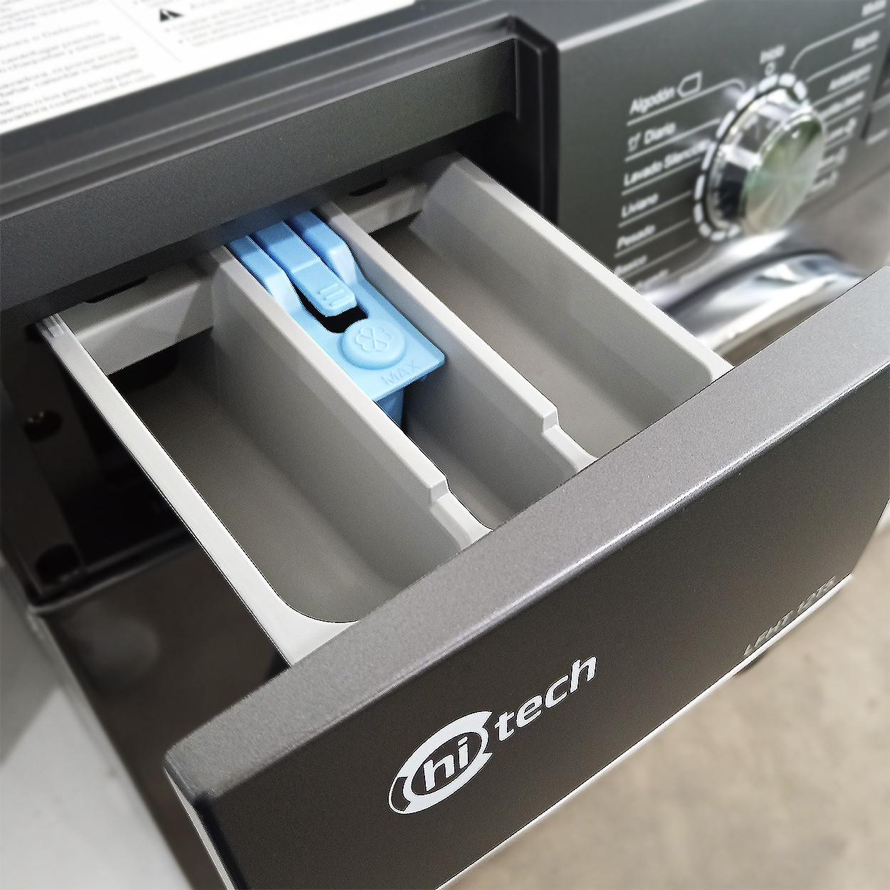 | HITECH Lavadora de 12Kg, Carga Frontal, Ciclo de Lavado de Tres, 16 Programas de Lavado, Tambor de Acero Inoxidable, Color Gris. |